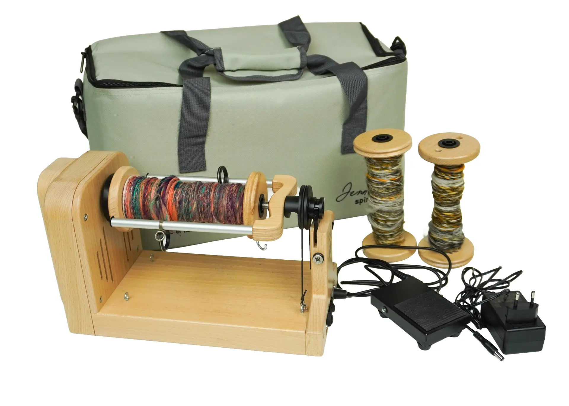 Onze Jenn E-spinner heeft een aan/uit-schakelaar met voetpedaal en een draaiknop voor handmatige snelheidsregeling. Draairichtingsschakelaar, Z/S en een neutrale stand (die ook als uit-stand kan worden gebruikt).