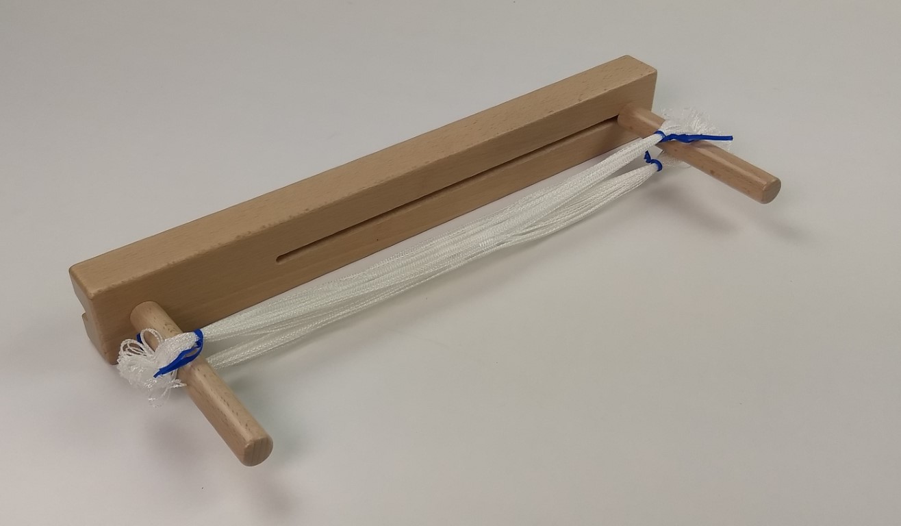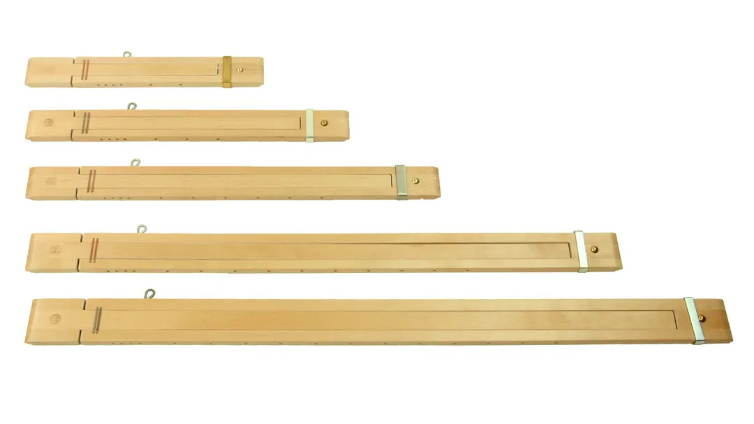 Een set van twee latten met elk twee gaten, waardoor het kruispunt van de kettingdraden makkelijk te onderscheiden is en de draden in de juiste volgorde blijven.