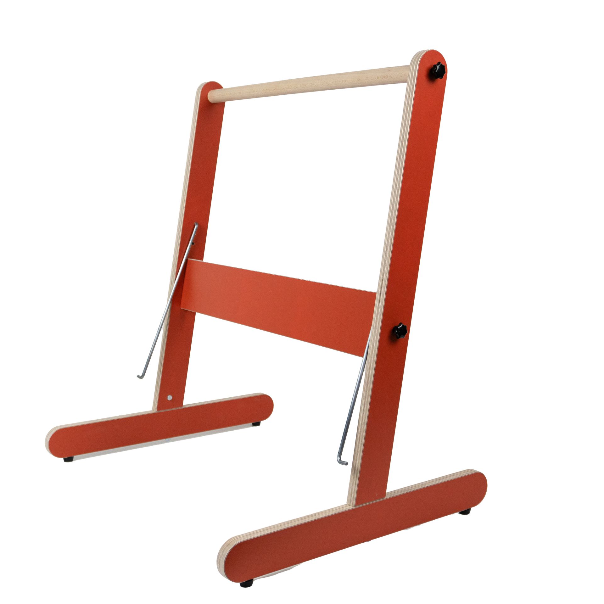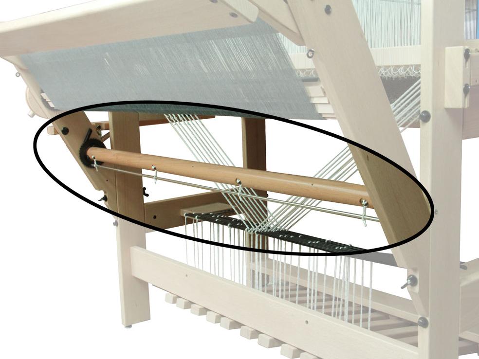 Deze tweede scheerboom, compleet met koorden, strijkboom, aanbindlat, kruislatten en opboomlatten, monteer je in het achterdeel van de weefgetouw. De tweede strijkboom heeft blokjes voor de bevestiging aan de eerste strijkboom; hij is er gemakkelijk op en af te schuiven.