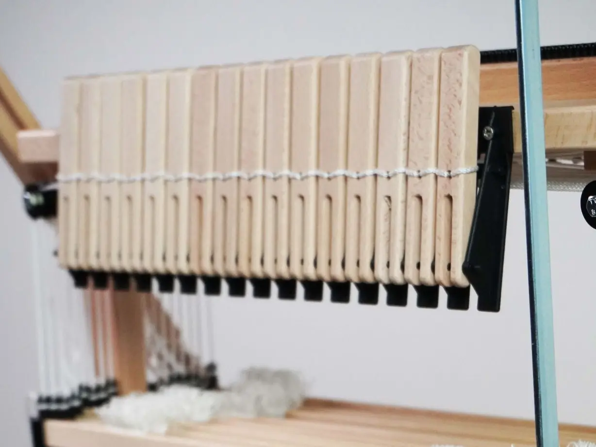 Met de mechanische dobby programmeer je eenvoudig je weefpatroon met kieslatjes en nokjes, in plaats van trappers aan te binden.